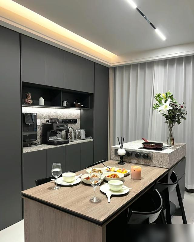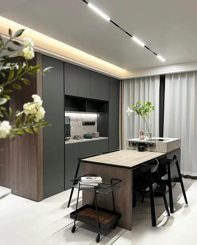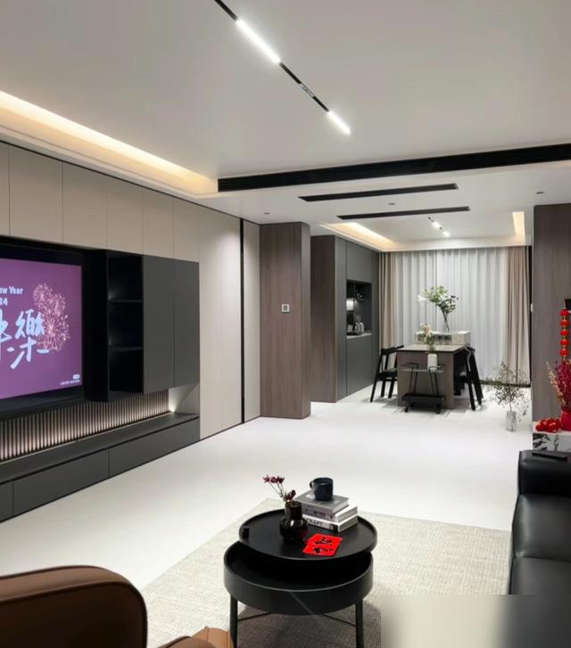 無主燈設計現在不稀奇,但磁吸軌道燈配燈帶的組合拳打得漂亮,光線像給空間敷了層柔光面膜,深色沙發配淺灰地毯的搭配也耐臟耐看,熊孩子打翻果汁都不慌。