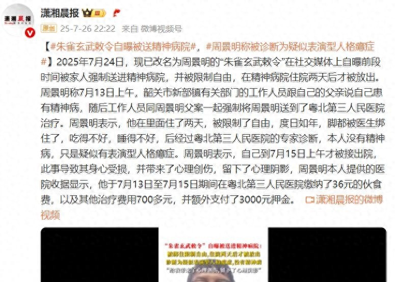 刷朋友圈的時候,看到一個挺扎心的事兒,說是朱雀玄武敕令,也就是現在叫周景明那個小伙,他最近把自己被“誤送”進精神病院的遭遇,全都在網上說出來了。事發時間差不多是7月13號,人家那會兒正在家待著,突然自家父親和當地工作人員就一塊上門了,說他有精神方面的問題,直接就把他抓上車送進了醫院。