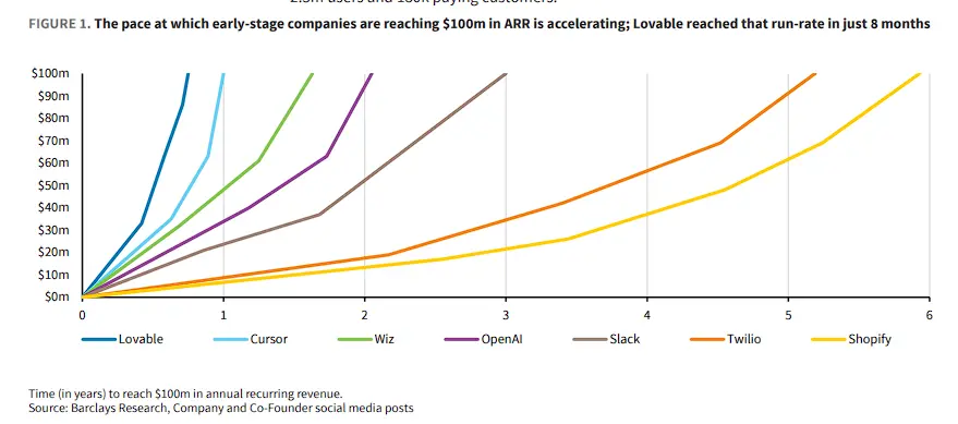 據(jù)巴克萊研究報(bào)告顯示,該公司僅用8個(gè)月就達(dá)到了1億美元ARR,成為達(dá)成這一里程碑最快的公司之一,這一速度超過(guò)了Cursor、OpenAI、Slack等知名科技公司的早期增長(zhǎng)記錄。
