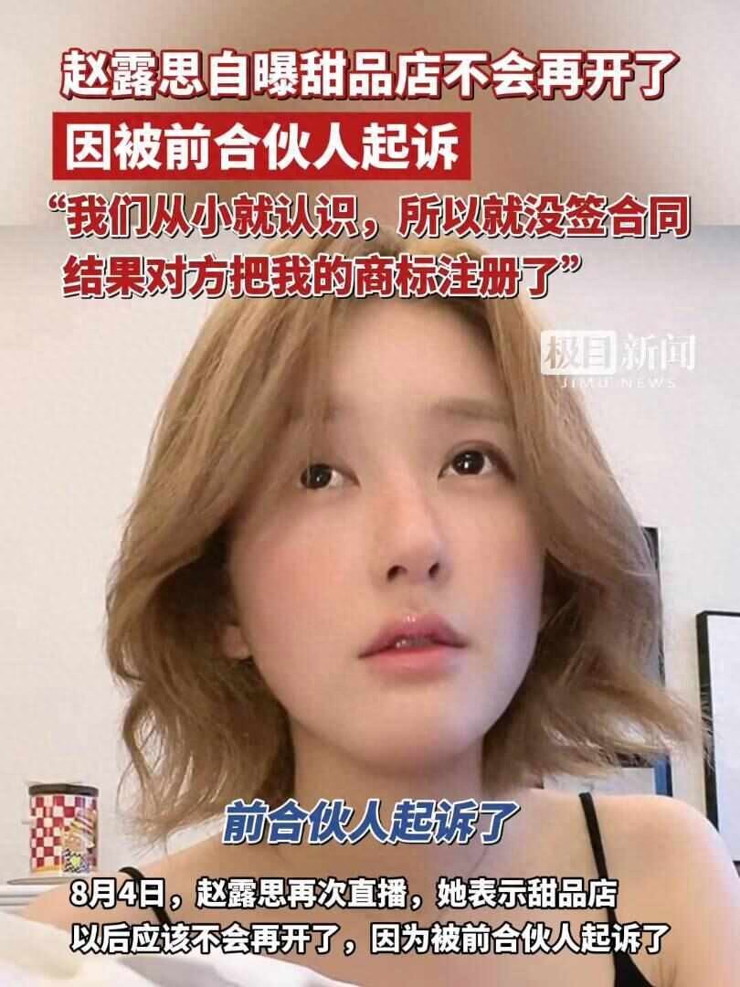 8月4日,趙露思再次直播,她表示,“甜品店以后應該不會再開了,因為我被我的前合伙人起訴了。
