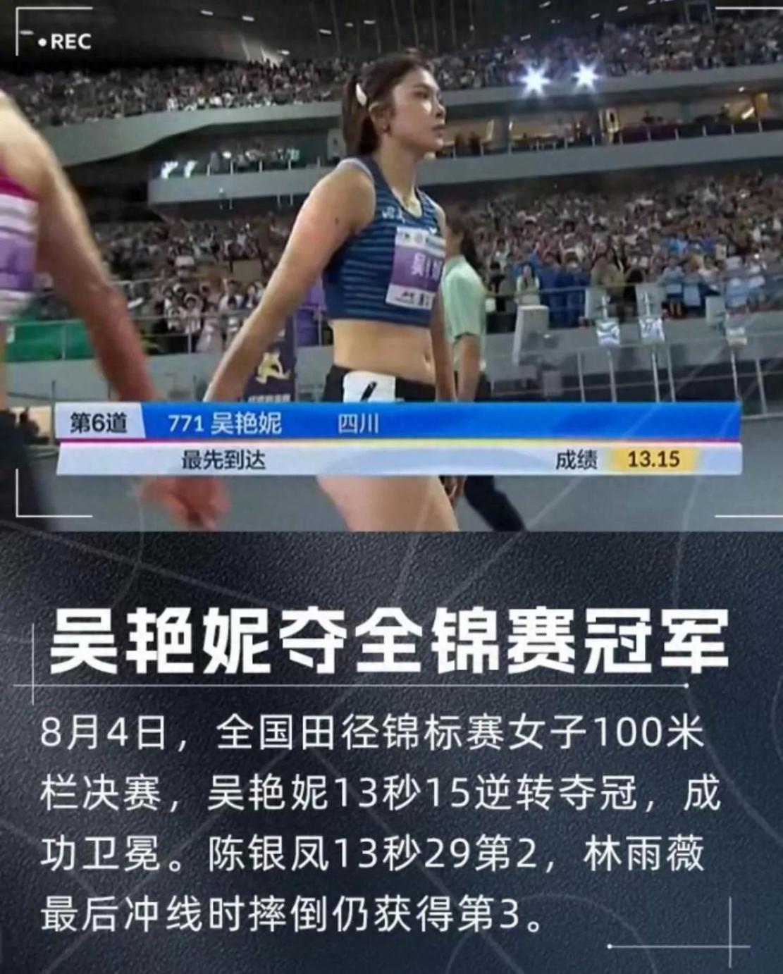 鄰道的福建名將林雨薇受其影響,終點線前踉蹌摔倒,手臂擦傷滲血,仍咬牙以13秒29拼下銅牌。而四川名將吳艷妮在對手接連失誤中穩守節奏,最終以13秒15的成績衛冕冠軍,成就該項目史上首個三連冠。