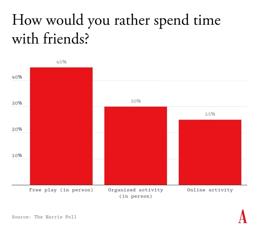 一張圖表圖片,展示了對(duì)“你更愿意如何與朋友共度時(shí)光?”這一問(wèn)題的回答。45%的受訪者選擇面對(duì)面的自由玩耍,30%選擇面對(duì)面的有組織活動(dòng),25%選擇在線活動(dòng)。