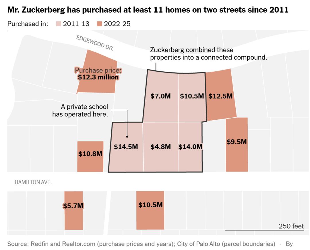扎克伯格將社區兩條核心道路——埃奇伍德路(Edgewood Drive)和漢彌爾頓路(Hamilton Avenue)當作現實版“大富翁”棋盤,豪擲超過1.1億美元收購至少11套房產,單套最高出價達到1450萬美元,是市價的1到2倍。
