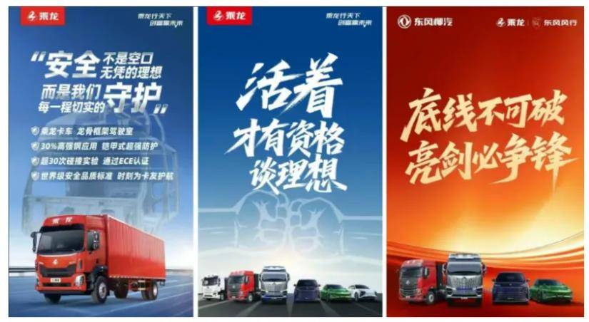 理想i8上市撞卡車凸顯安全,理想粉絲們看爽了;7月31日乘龍汽車開始連續“反擊”理想,第一天發表聲明表示“理想未經授權使用視頻,測試車未遮蓋車標,貶低品牌形象”,第二天發表《致乘龍卡友的一封信》表示測試場景和實際情況差異極大,不要偏聽則信,第三天推送海報內涵“活著,才有資格談理想”,第四天則喊出“龍的脊梁,無懼挑戰”硬氣宣言。