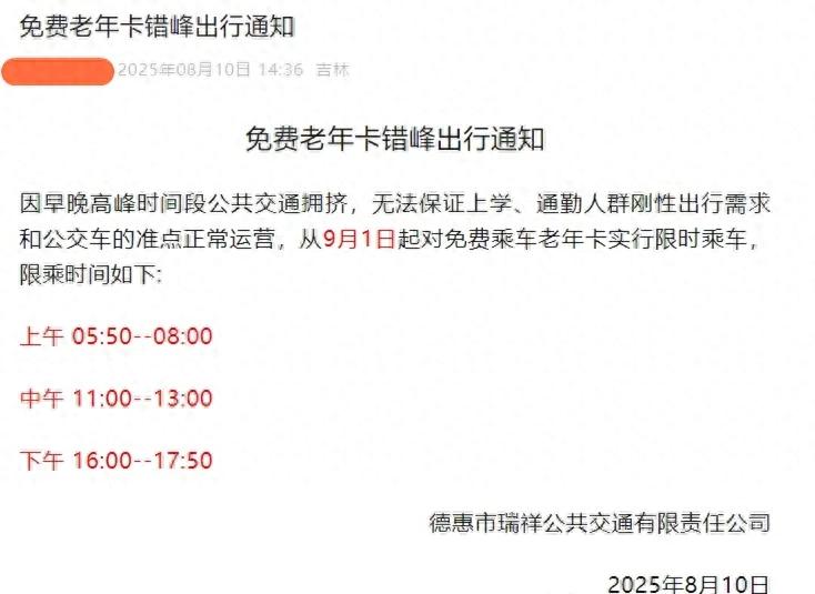 據報道,8月10日,吉林省德惠市發布“免費老年卡錯峰出行”的通知。通知提到,因早晚高峰時間段公共交通擁擠,無法保證上學、通勤人群的剛性出行需求等,從9月1日起對免費乘車的老年卡實行限時乘車,具體限制覆蓋早(5:50—8:00)、午(11:00—13:00)、晚(16:00—17:50)三個高峰時段。