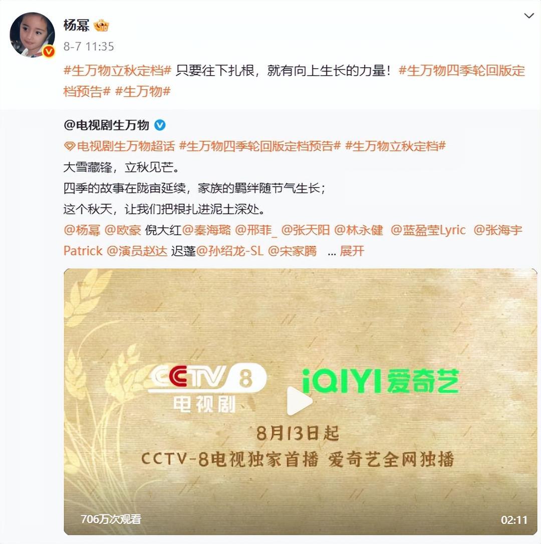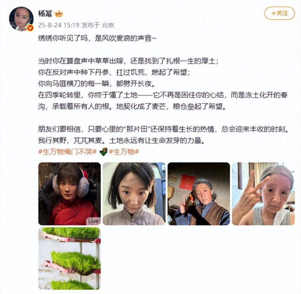 2025年8月24日,楊冪通過社交媒體發布長文,正式告別電視劇《生萬物》及飾演的角色寧繡繡。這篇題為《我行其野,芃芃其麥》的告別信,以詩意語言回望角色從富家千金到堅韌農婦的蛻變歷程,并引發觀眾對土地、時代與個體命運的深層思考。