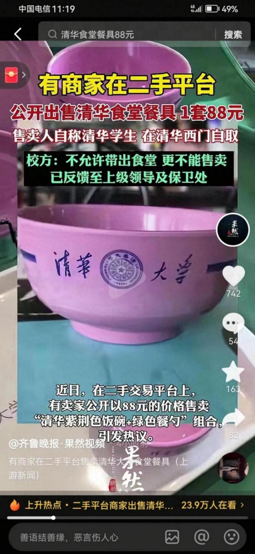 其實這種事不新鮮,去年北大未名湖水被賣過,當時也鬧挺大。清華餐具被炒成商品,可能因為紫荊色碗和綠色勺子比較有辨識度,在學生中也算特色物件。