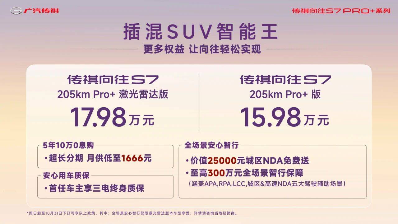 在如此級別的堆料數量和用料質量之下,傳祺向往S7全新Pro+系列15.98萬元、17.98萬元,更帶來傳祺史上最給力的金融政策:5年10萬0息,月供低至1666元,還有價值25000元城區NDA免費送、至高300萬元全場景智行保障,首任車主還可享三電終身質保,讓向往的力量延展到千里之中。