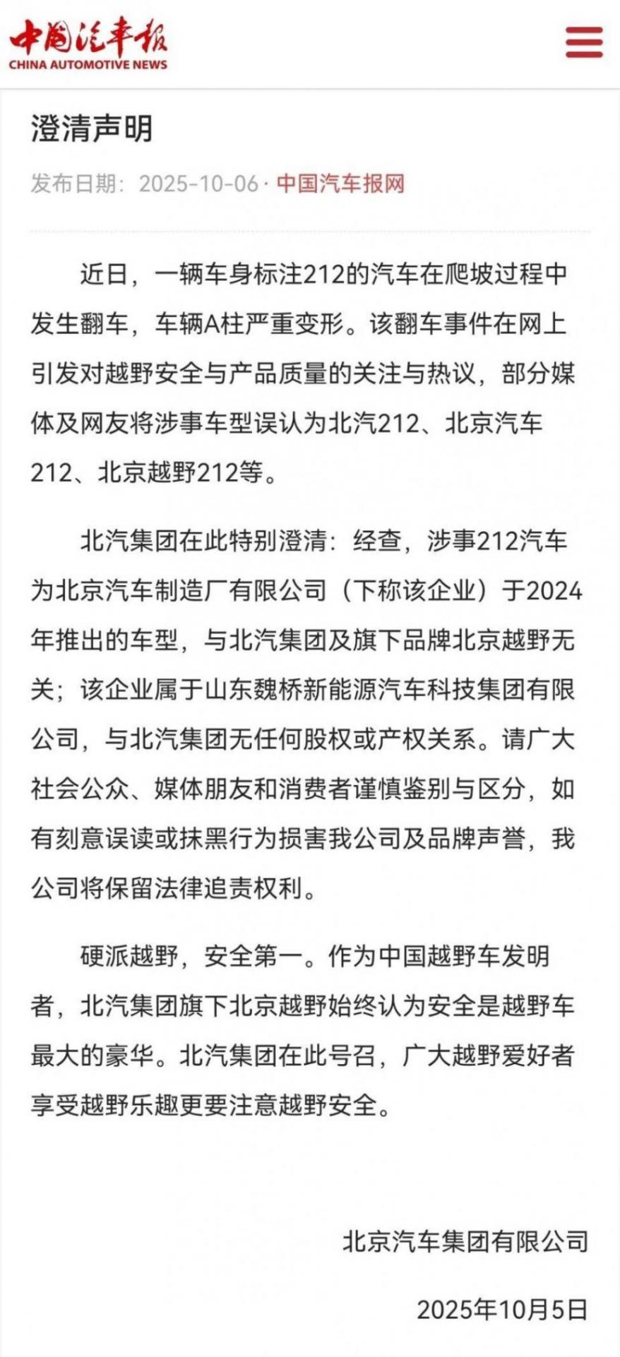 ——“北京212”因車手操作不當(dāng),發(fā)生了意外。北汽集團(tuán)為什么不斷發(fā)聲明?而北京汽車制造卻一聲不吭?