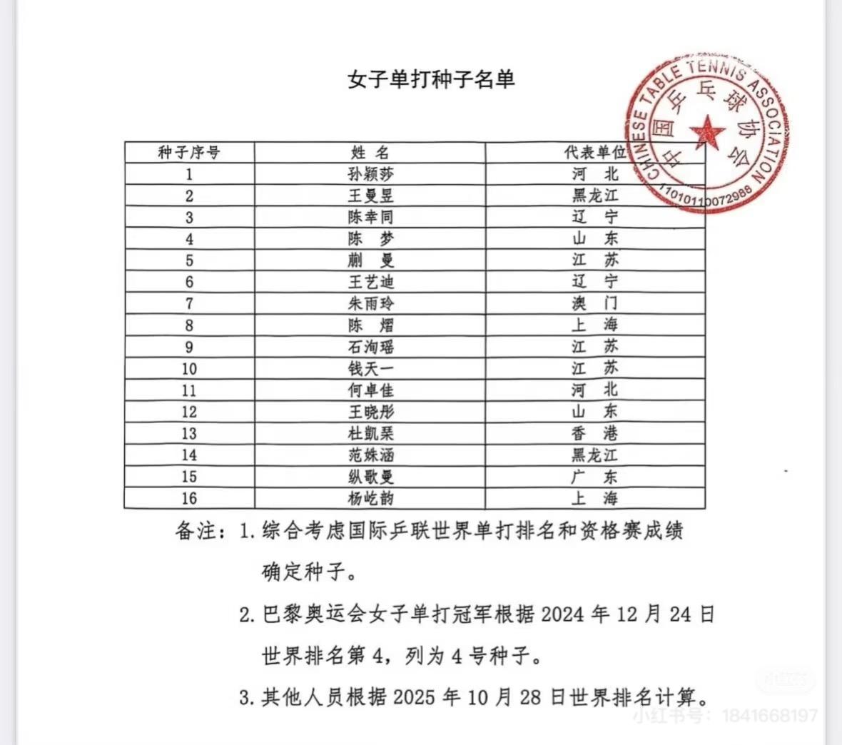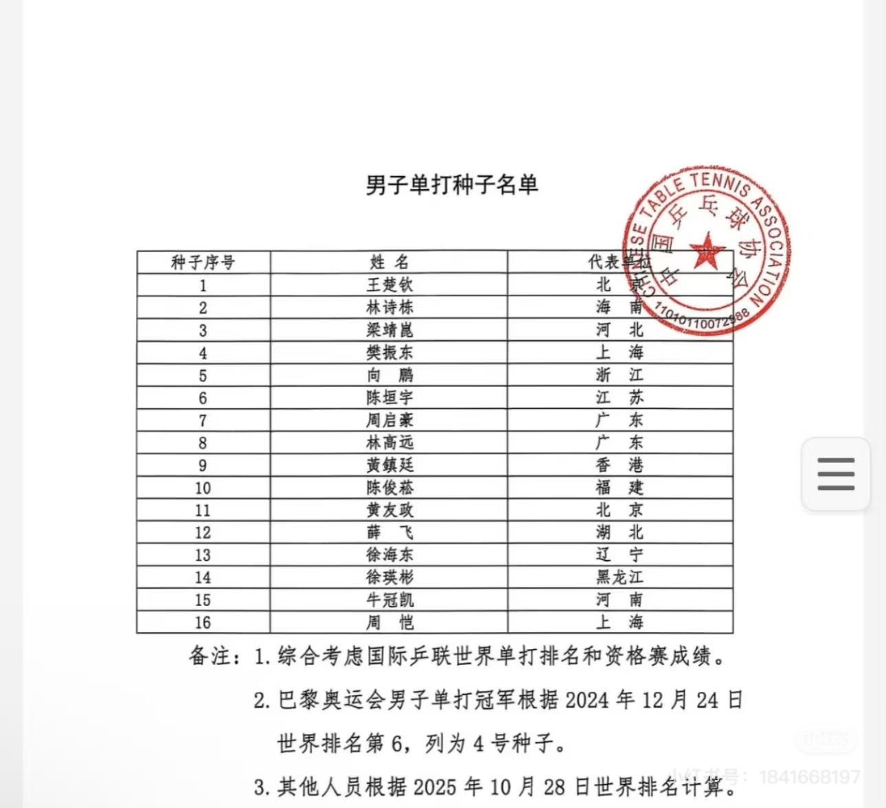 昨晚,全運會乒乓球項目種子名單出爐。已退出世界排名的樊振東和陳夢根據2024年12月24日的世界排名,列為男女單打4號種子。