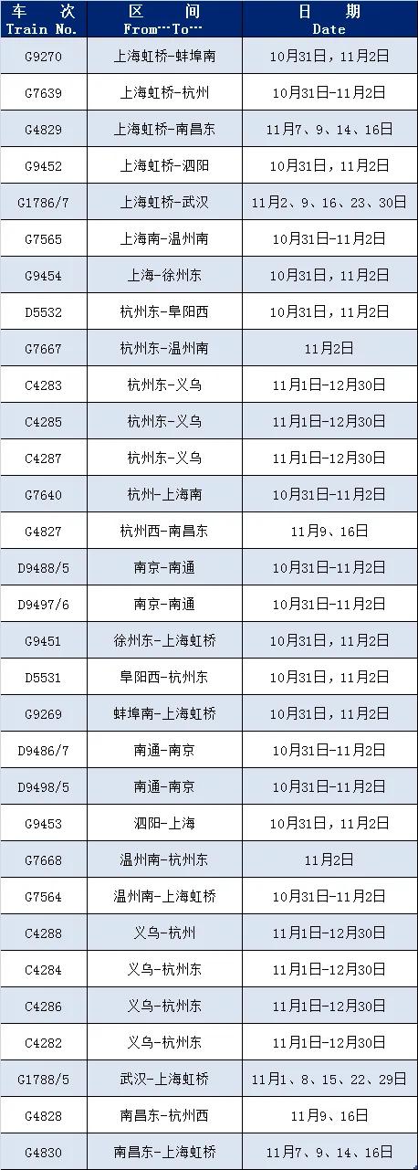◆ 短期集中:10月31日-11月2日(如 G9270、G7639、G9452等多車次集中增開),應對階段性客流高峰。