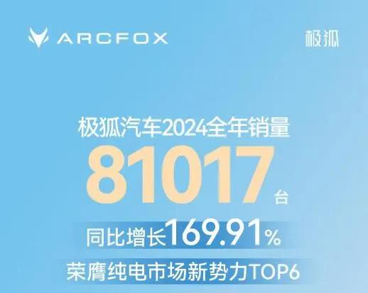 北汽新能源旗下極狐品牌2024年累計銷量達成81017臺,同比增長169.91%,連續3年實現銷量翻番。具體來看,極狐全年交付2.17萬輛,全年交付3.71萬輛,極狐考拉全年交付1.93萬輛。