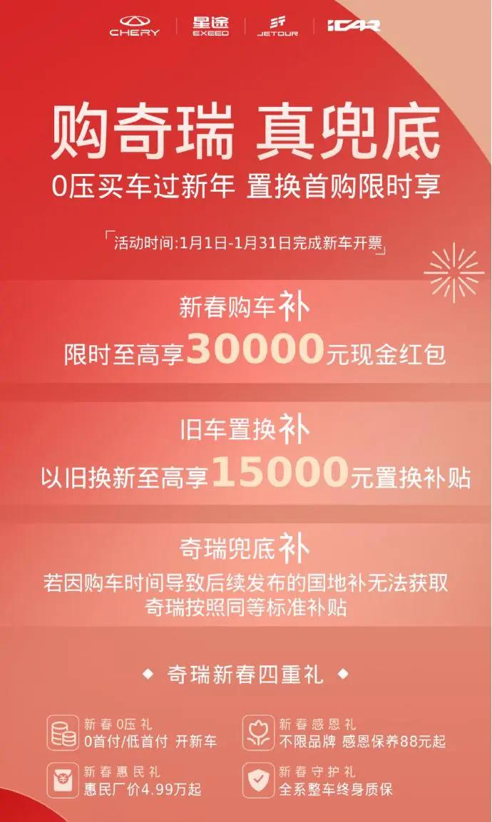 捷途高達(dá)4萬(wàn)元的以舊換新,和高達(dá)3萬(wàn)元的返鄉(xiāng)補(bǔ)貼力度最為激進(jìn);而捷途的兄弟品牌星途,凌云300T超越版限時(shí)優(yōu)惠3萬(wàn)元,瑤光C-DM超越版限時(shí)優(yōu)惠2萬(wàn)元,力度僅次于捷途;而奇瑞品牌限時(shí)最高3萬(wàn)現(xiàn)金紅包,還有最高1.5萬(wàn)的置換補(bǔ)貼,以及國(guó)補(bǔ)兜底。奇瑞系品牌較為激進(jìn),勢(shì)要在新的一年再度躍進(jìn)。